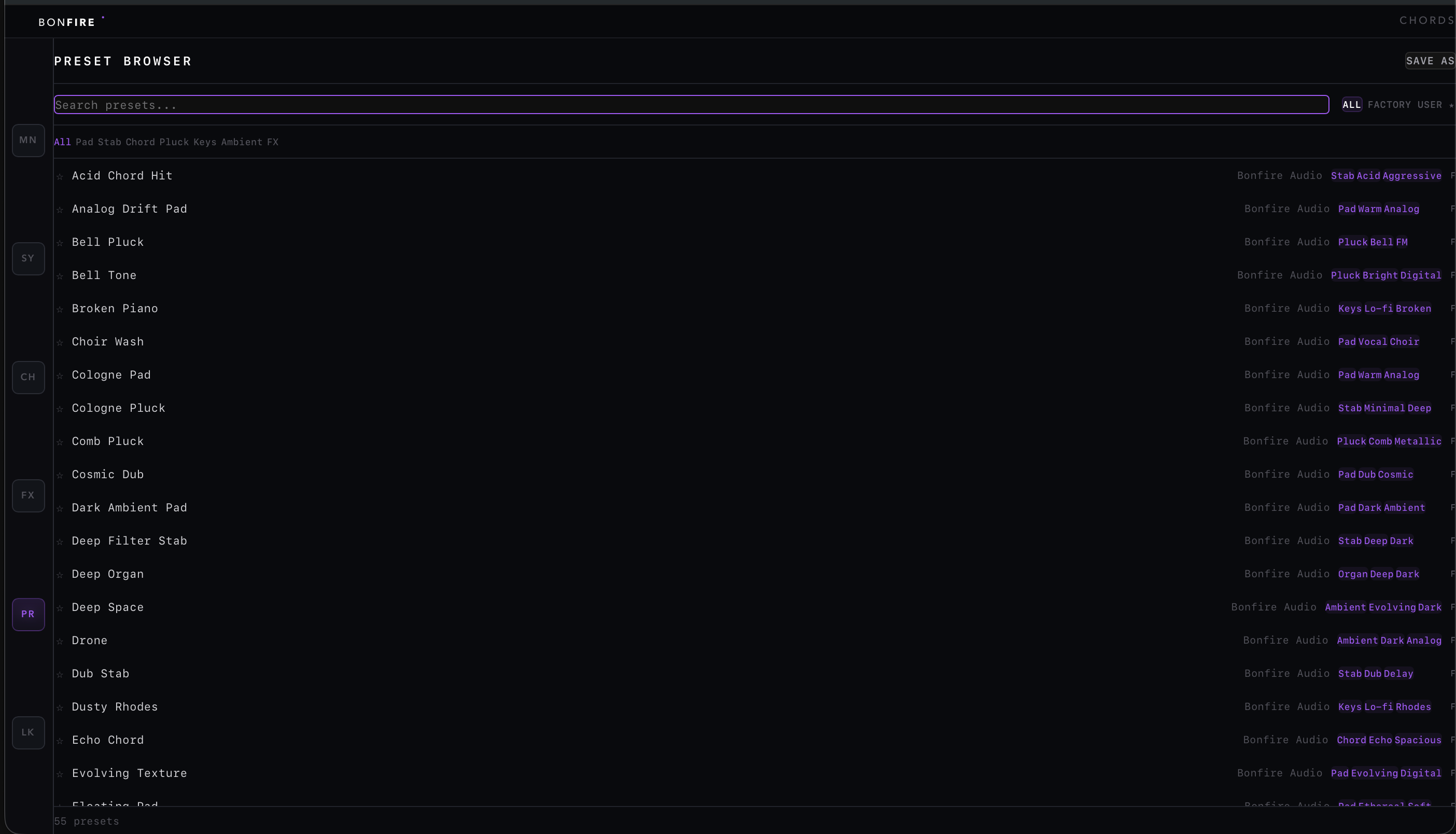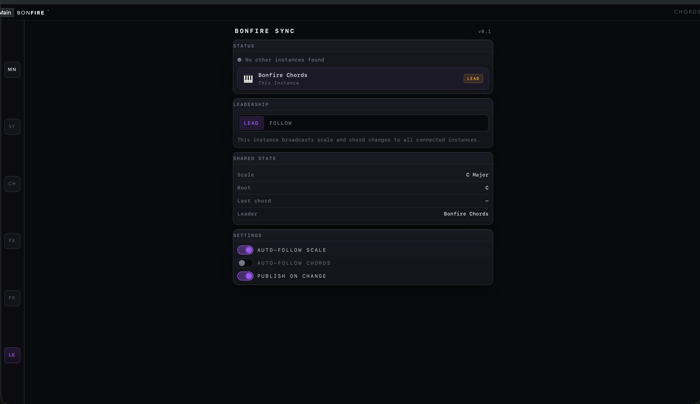 - 02Bonfire Sync protocol — Inter-plugin communication via shared memory. Leader broadcasts harmonic state (scale, root, chord) to followers in real-time. Enables Bonfire Bass and Bonfire Chords to stay harmonically synced in a DAW session.