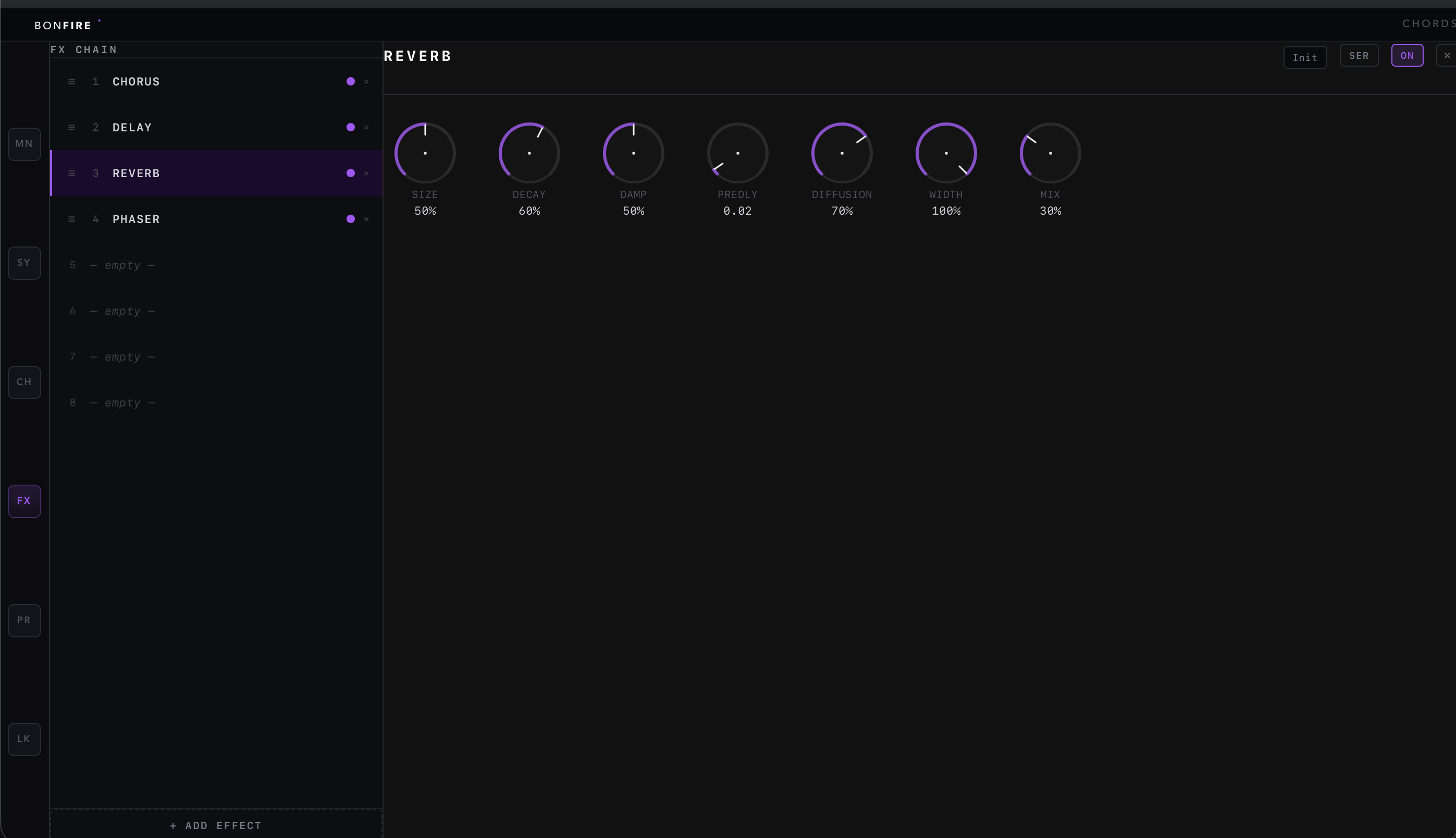 - 06Modular FX rack — 8-slot drag-reorderable effects chain using BonfireDSP effect factory pattern. Each slot can host any effect type.